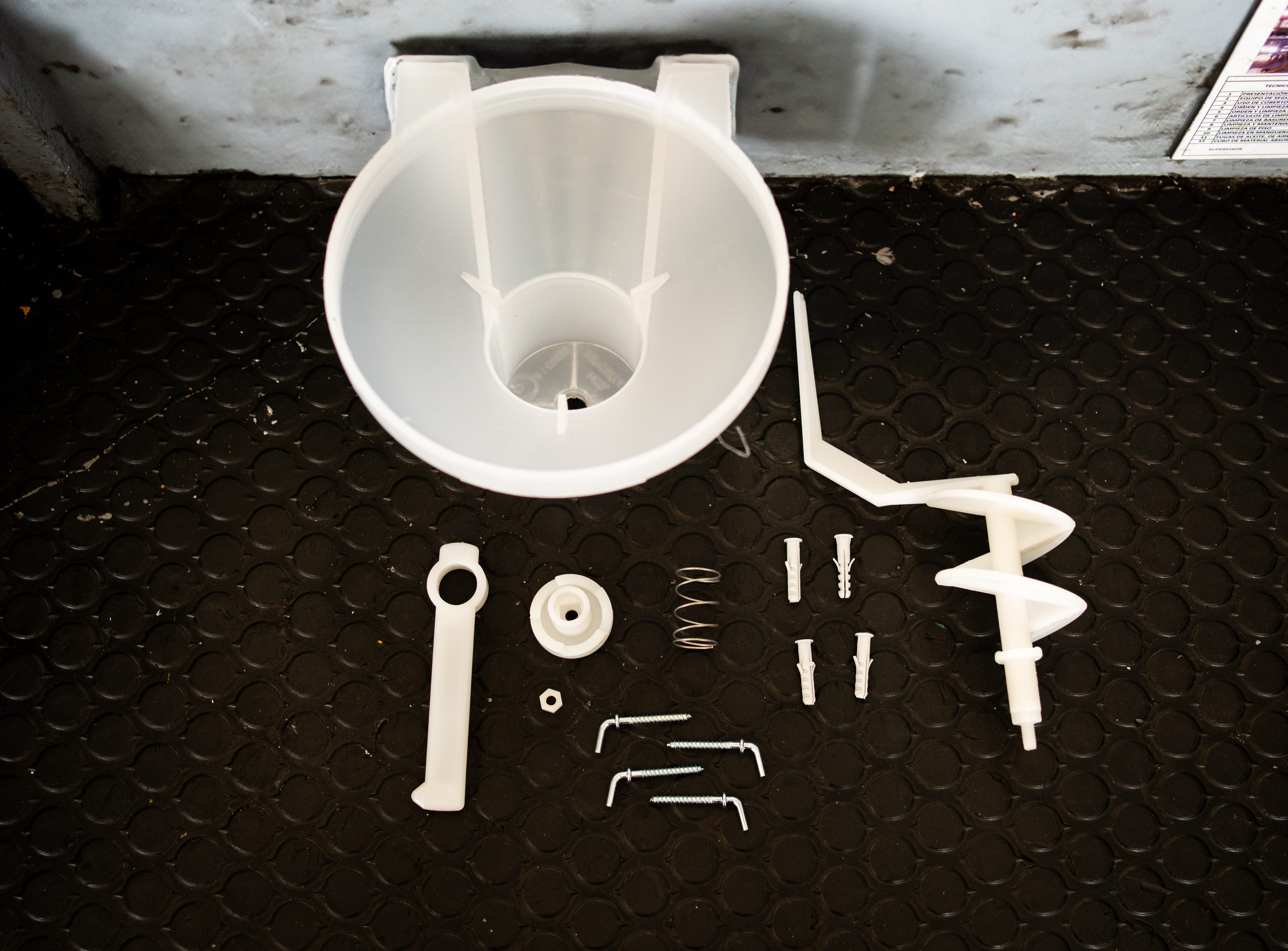 Contenido: Dispensador, Espiral, Palanca dosificadora, Módulo de encaje redondo, Resorte, (4) tarugos, (4) tornillos cargadores y Tuerca de fijación.